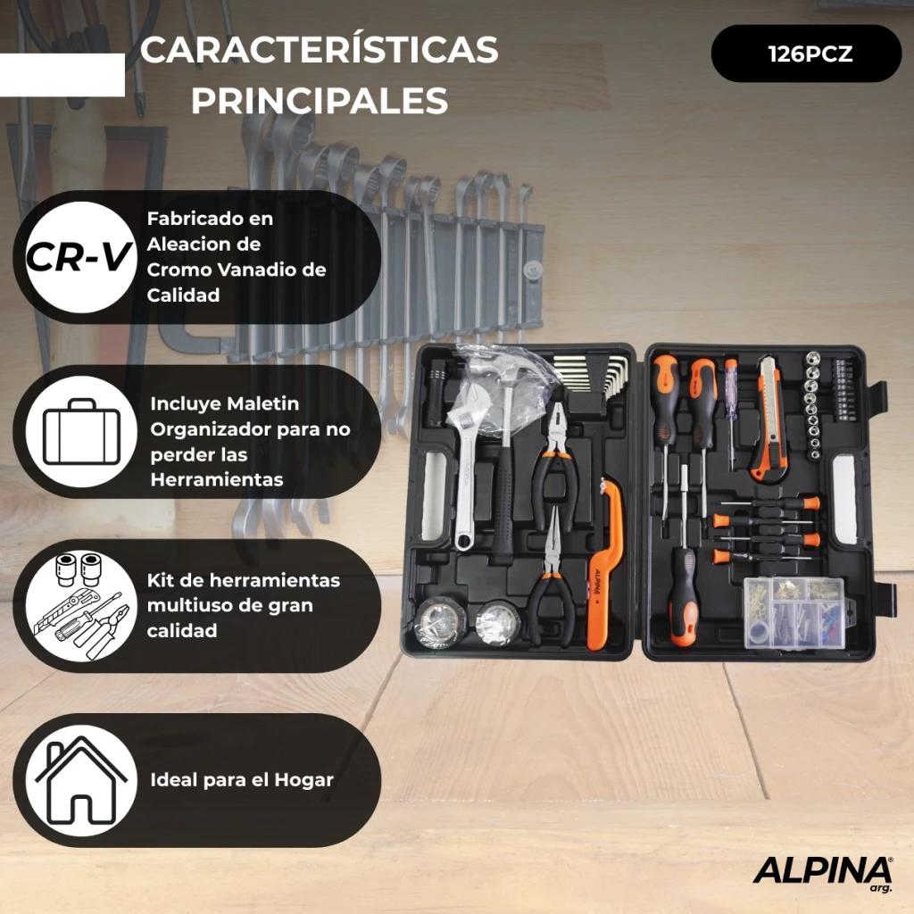 Set Caja De Herramientas de Hogar Reforzado ALPINA 126 Piezas